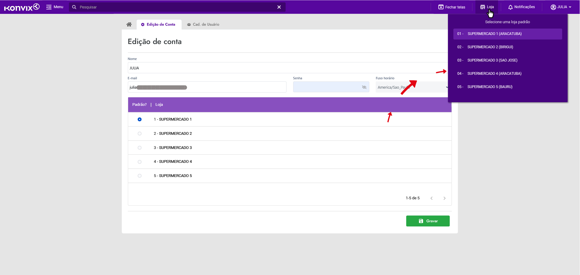 Além disso, é possível configurar uma Loja Padrão. Essa configuração funciona de forma semelhante à seleção feita no menu suspenso, mas será salva automaticamente ao concluir as alterações.