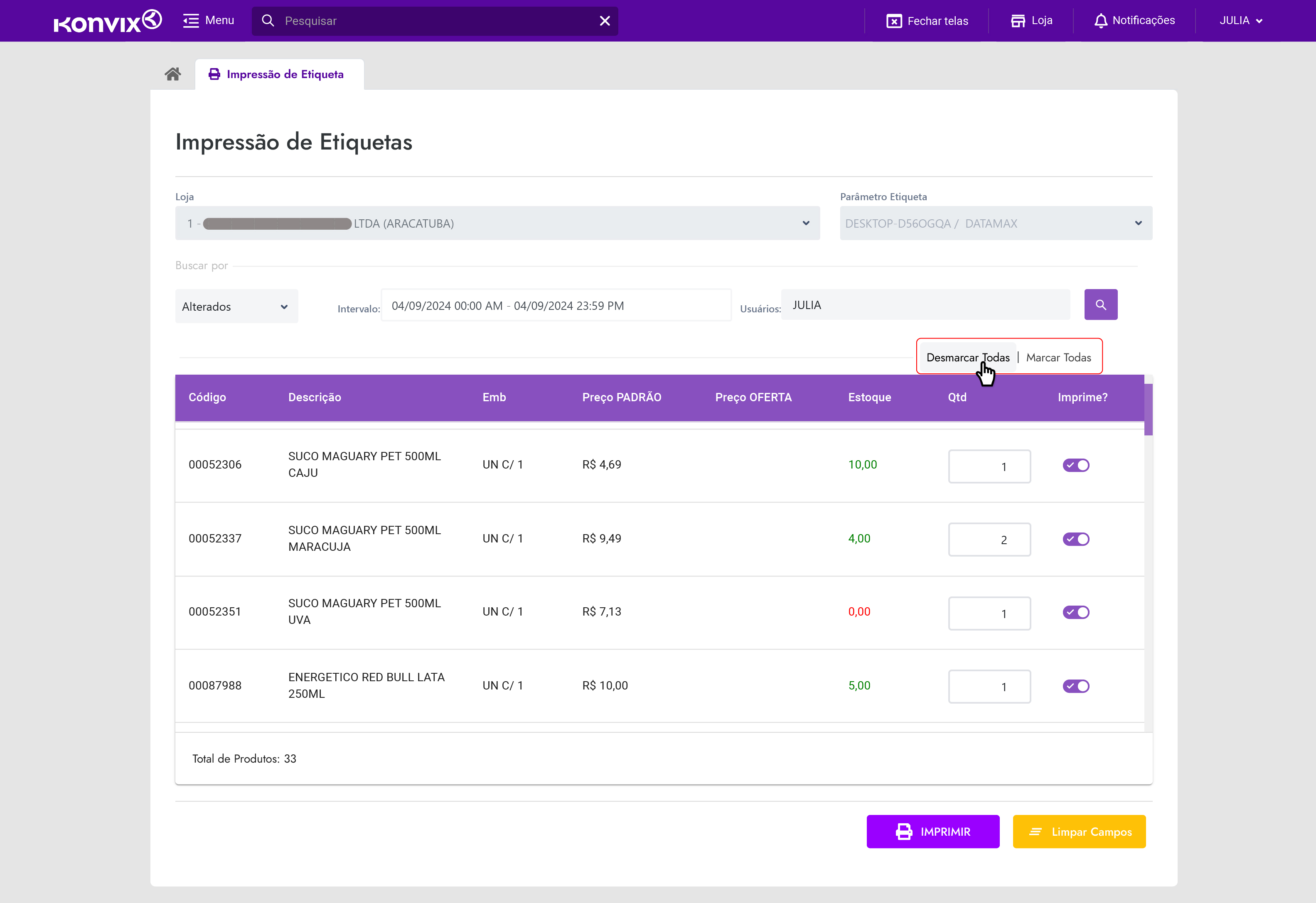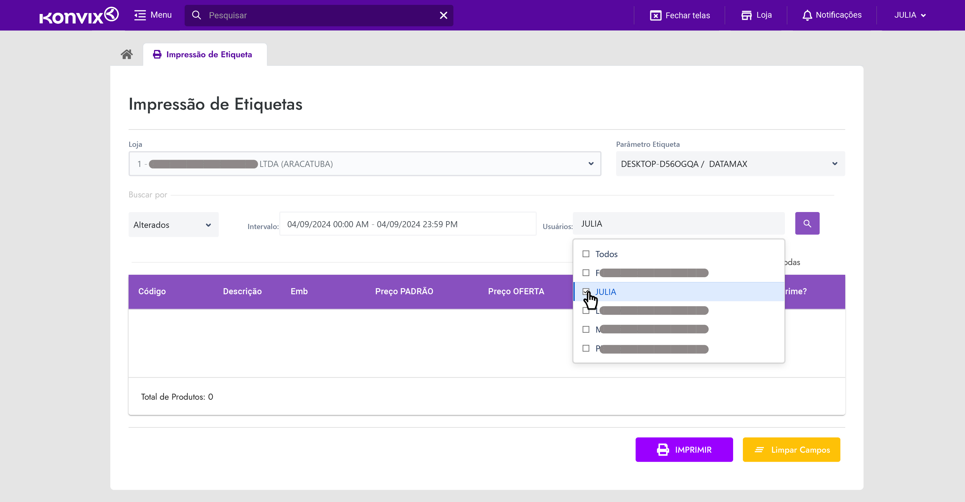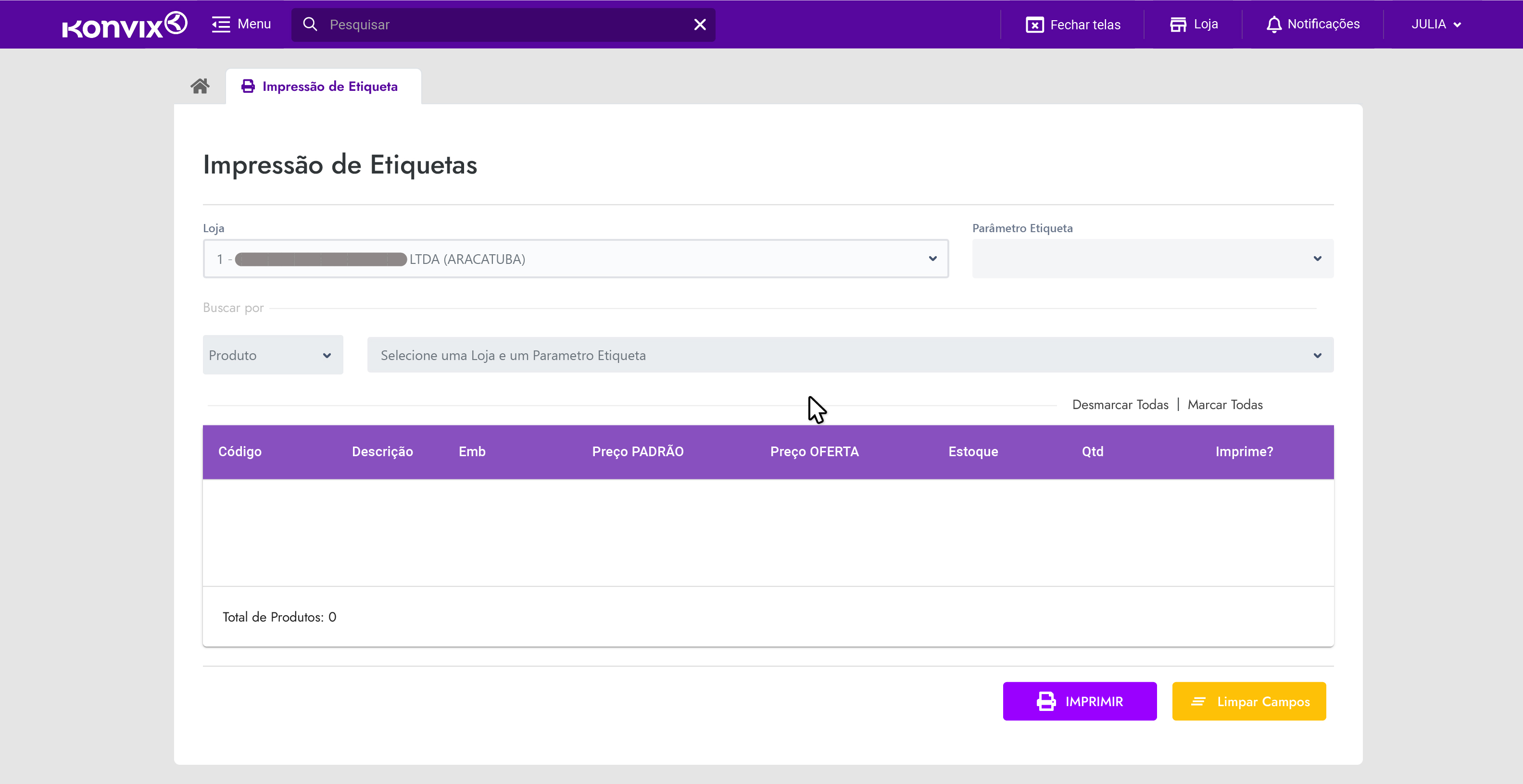Por meio dessa tela é possível enviar para a impressora de etiquetas quais produtos precisam de novas etiquetas com as suas devidas quantidades, de acordo com a ocupação do item na loja. Ao abrir a tela, já é possível ver o seu formulário. Sua visão inicial é esta: