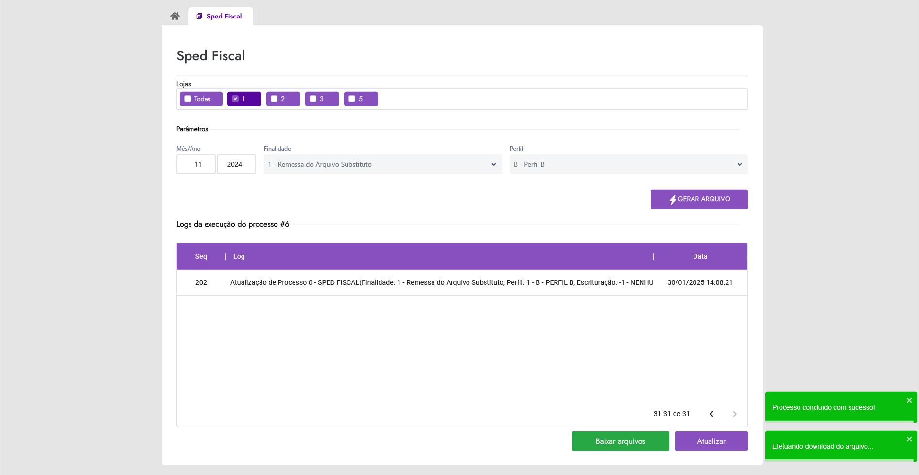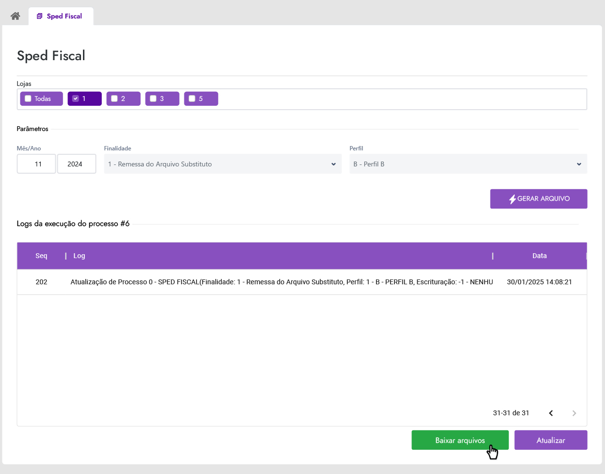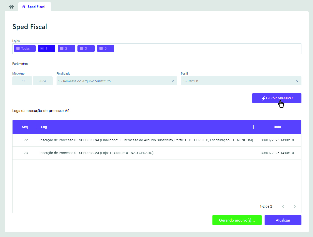 Importante: O sistema atualiza os logs automaticamente a cada 5 segundos. Caso prefira, clique no botão Atualizar para exibir os logs manualmente.