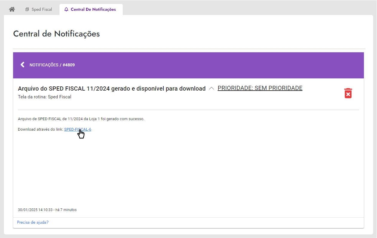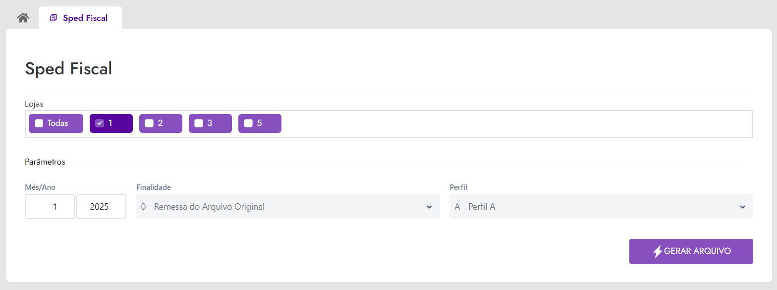 A tela SPED Fiscal foi desenvolvida para atender às exigências fiscais relacionadas à geração do arquivo SPED. Esse arquivo segue o layout estipulado pelo Guia Prático da Receita Federal, agrupando blocos de informações como abertura, documentos fiscais, apuração de ICMS e encerramento.