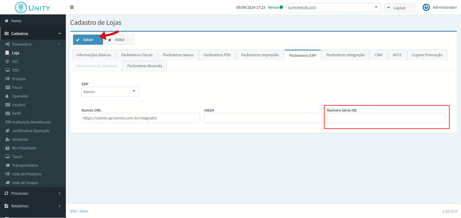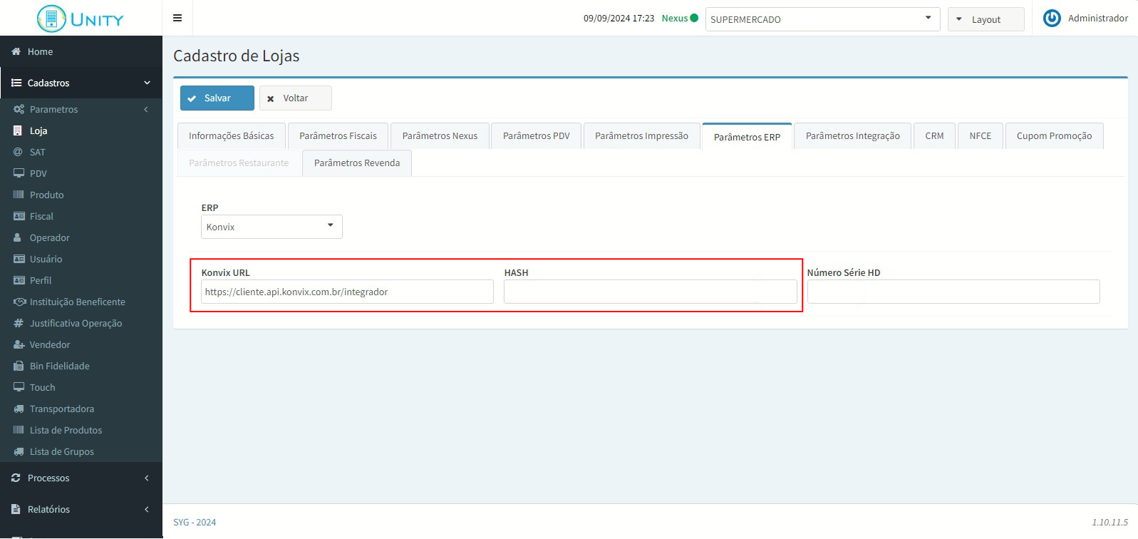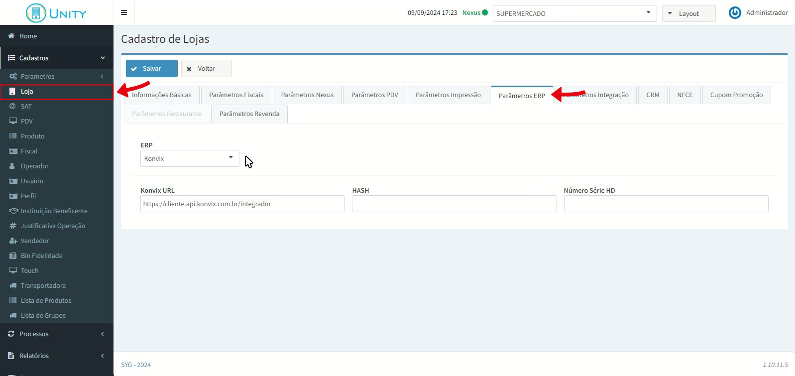 1. No Unity, abra a tela Cadastro de Loja, aba Parâmetros do ERP e selecione o ERP Konvix.